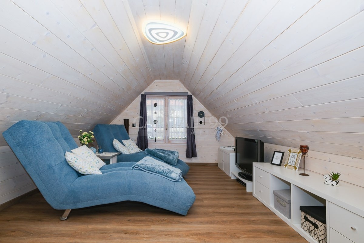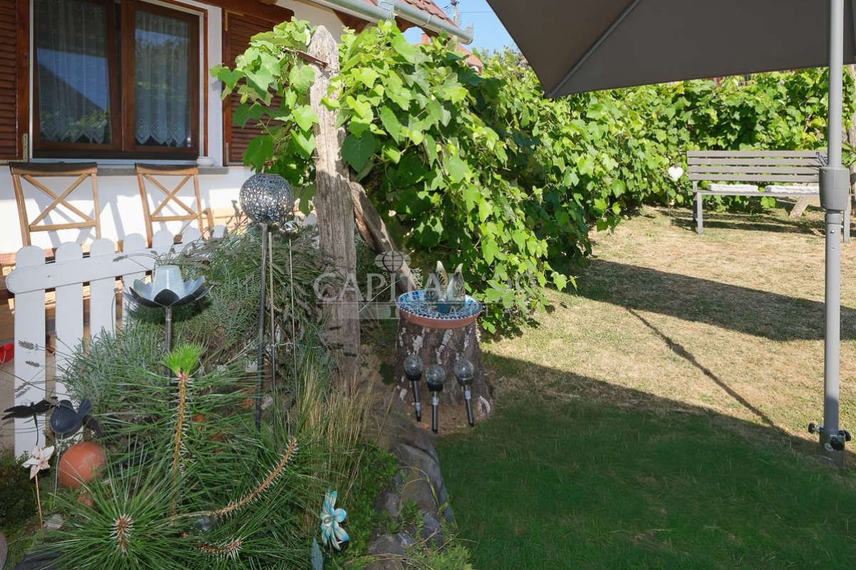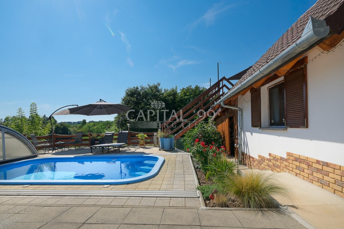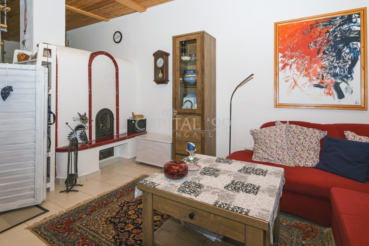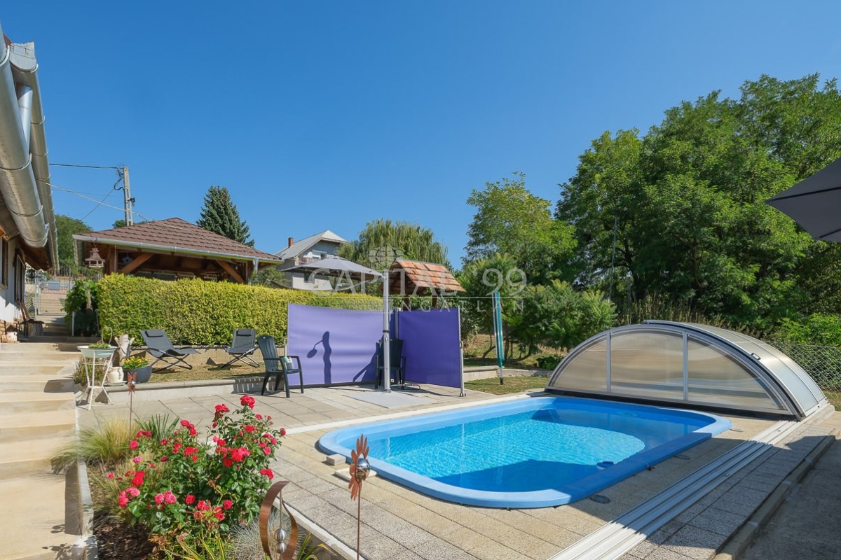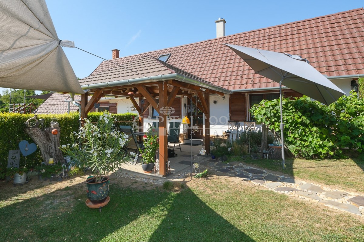 code number: 4335In the settlement of Nemesbük, next to Hévíz, the world famous spa town, is this nice and cosy cottage for sale. The detached house was built in the second decade of the last century, and in the year 2014 ist was completely refurbished. During the refurbishment works the house was endowed with a new roof, new windows and doors in and out. All basic public mains pipes and wirings have been changed (water, waste water and electricity). All tiles and parquets are new, and new sanitary wares were built in. New is the kitchen, the kitchen appliances, a wonderful tiled stove was built as alternative to the basic gas heating system the house is heated with. The attic floor was converted into a bedroom, a restroom and a study. The lot is lovingly cared for, it is planted with ornamentals. The yard comes with a counter-current swimming pool, with a terrace and a gazebo. The lot is endowed with a dug well, which is fit for garden irrigation.