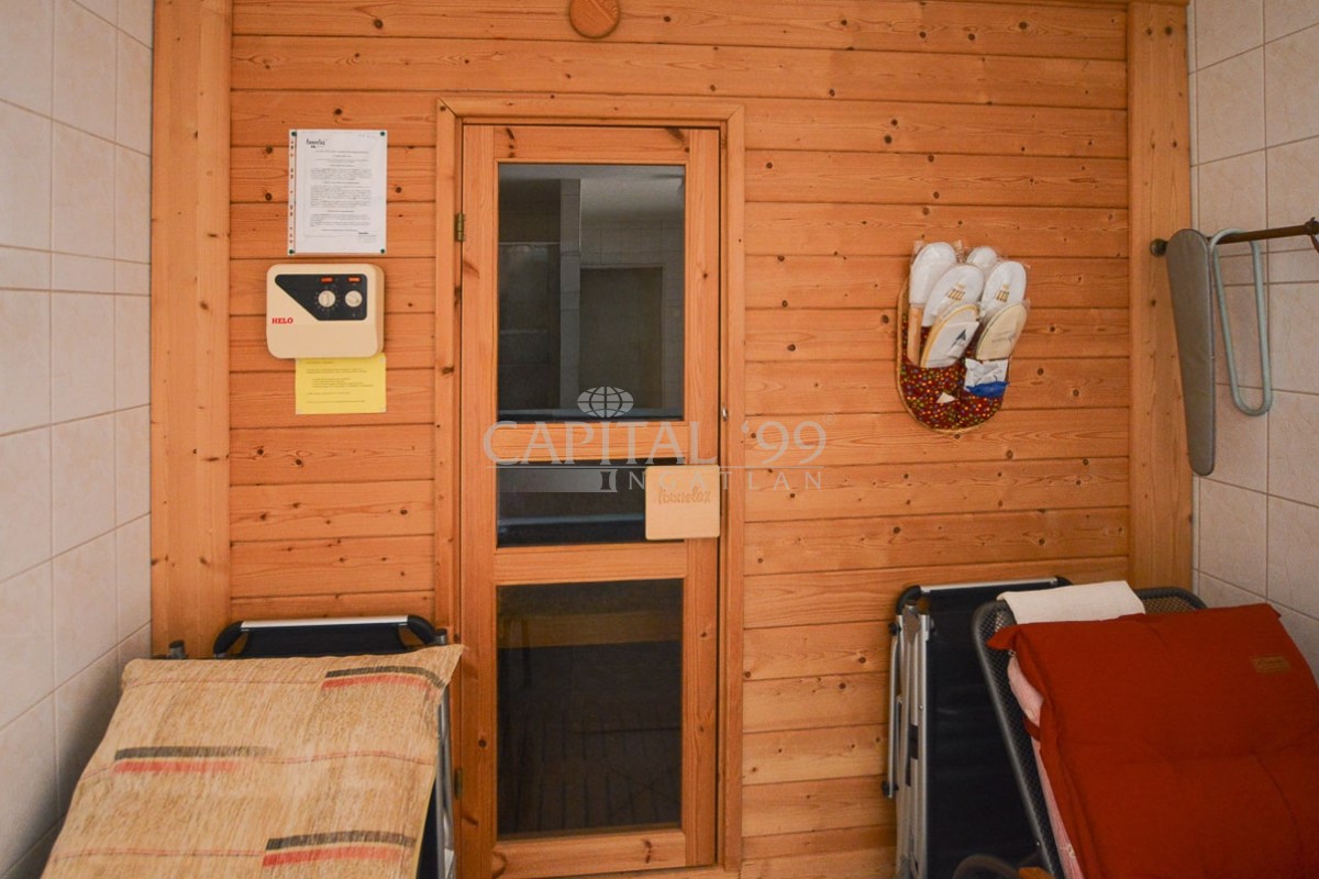 Ground floor: double garage 47.40 sqm, corridor 12.60 sqm, corridor 2.25 sqm, bedroom 13.05 sqm, bathroom + toilet 4.35 sqm, kitchen + sitting room 28.98 sqm, heating system + laundry room 11.20 sqm, shower 2.00 sqm, anteroom + sauna 20.57 sqm, wellness-area 27.10 sqm.