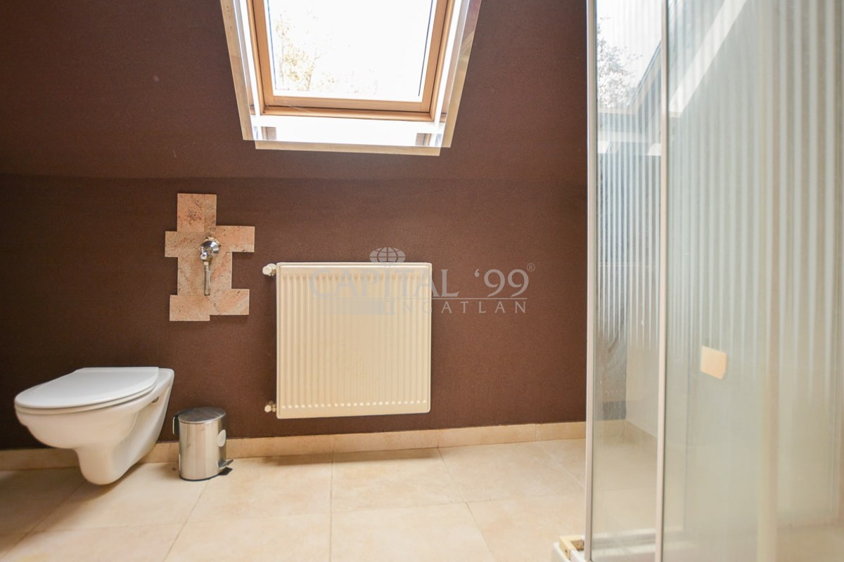 Downstairs 80 sqm: entryway, kitchen + dining room, larder, bathroom + toilet, laundry room + boiler room, sitting room, room, room. Terrace 8 sqm; double garage 35 sqm. Attic floor 70 sqm: room, room, vestibule, bathroom + toilet, wardrobe.