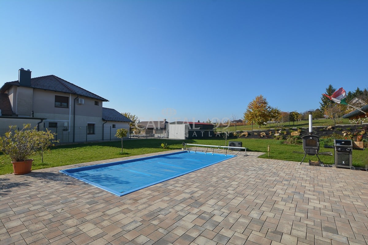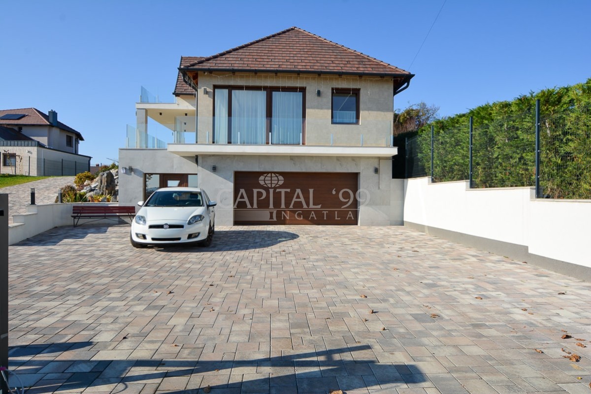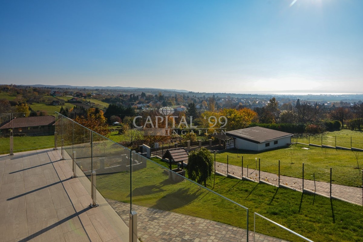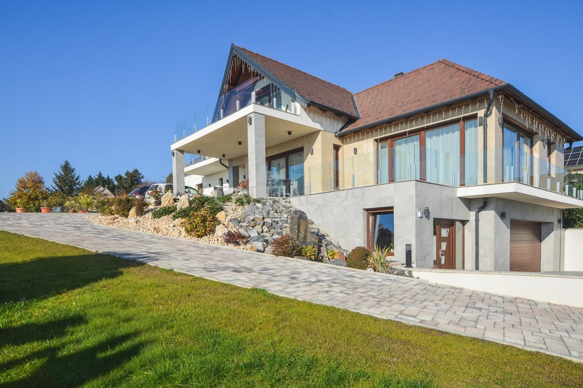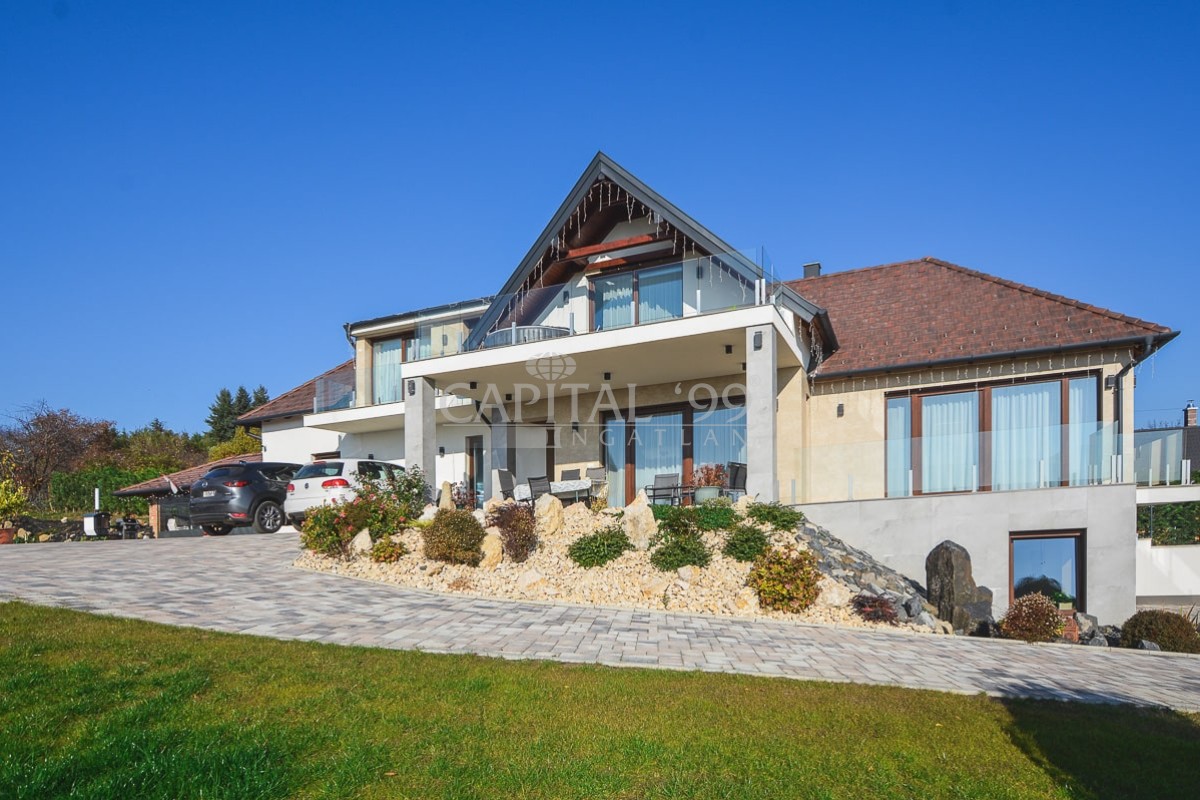 code number: 4349Centrally located in Cserszegtomaj is this detached house built on a lot with unobstructed and unobstructable panoramic view of the Lake Balaton for sale. The house comes with 3 storeys. In the cellar you can find hobby rooms, sauna, fitness room, vine cellar suitable for friends' gatherings, and a garage for 3 cars. The ground floor comes with a huge living room, kitchen, several bedrooms and bathrooms. The house is characterized by large rooms. An open and roofed south-east facing terrace opens from the kitchen. The attic floor also comes with large, very well useable rooms with access to terrace. An unobstructed lake view opens from both ground floor and attic floor terraces. The lot is very well tended, it is endowed with a summer kitchen + hobbyroom, and a heatable swimming pool. The house was built in quality building materials. For permanent residence is this house an ideal choice. This property is a really rear find on the market.