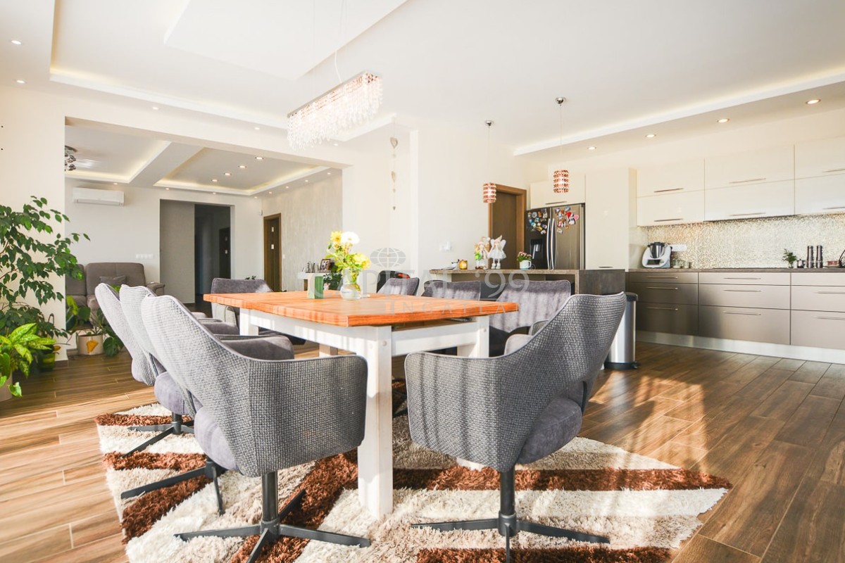Ground floor: sitting room 28.32 sqm, dining room + kitchen 35.13 sqm, larder 5.91 sqm, toilet 2.80 sqm, laundry room 4.64 sqm, shower + toilet 3.68 sqm, bedroom 12.18 sqm, bedroom 15.12 sqm, hall 8.23 sqm, walk-in wardrobe 5.15 sqm, bathroom + toilet 9.01 sqm, anteroom 6.64 sqm, terrace 27.07 sqm, terrace 19.11 sqm, hobby kitchen 30 sqm.
