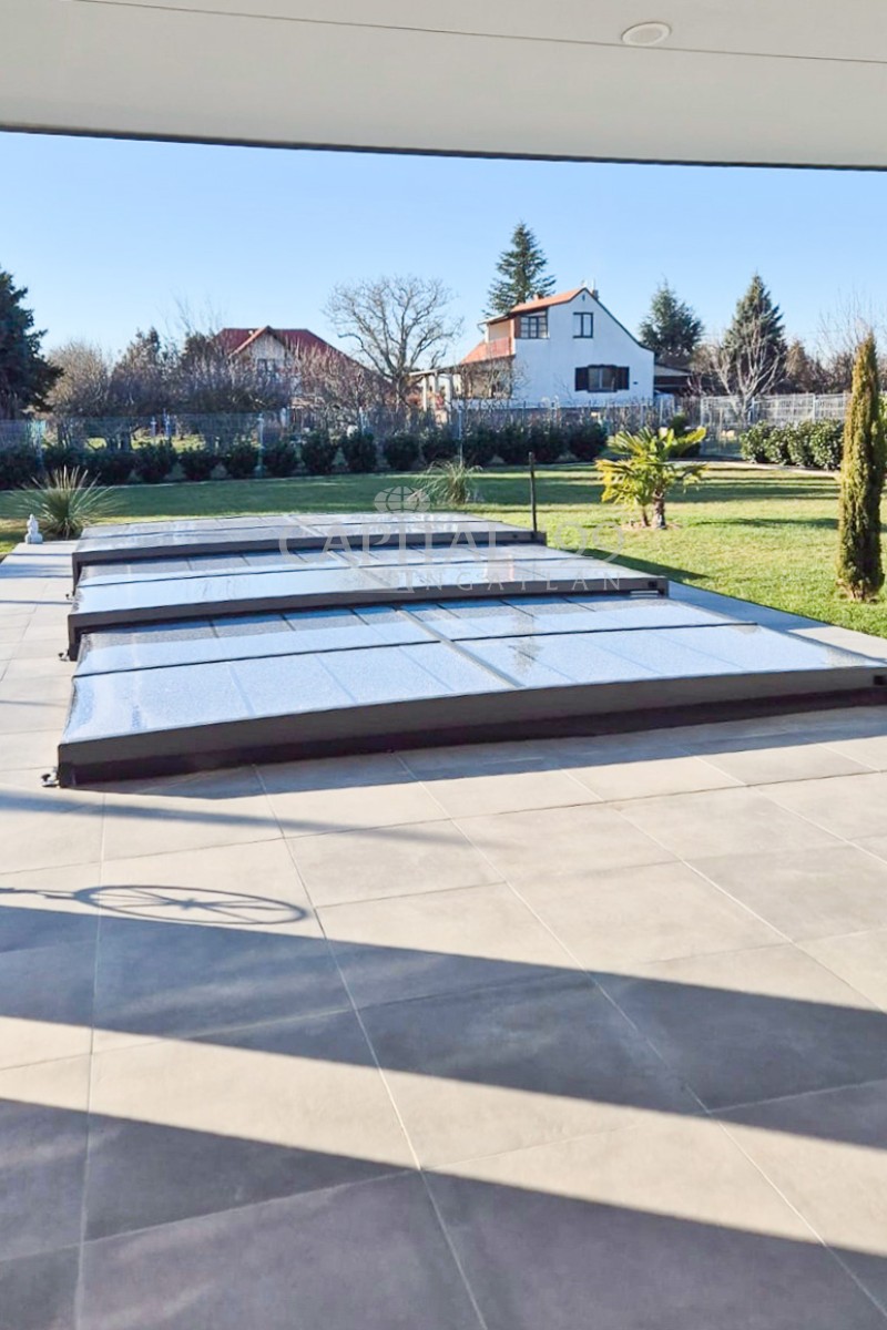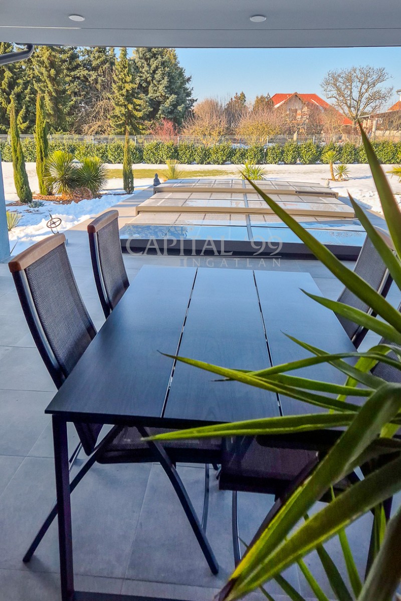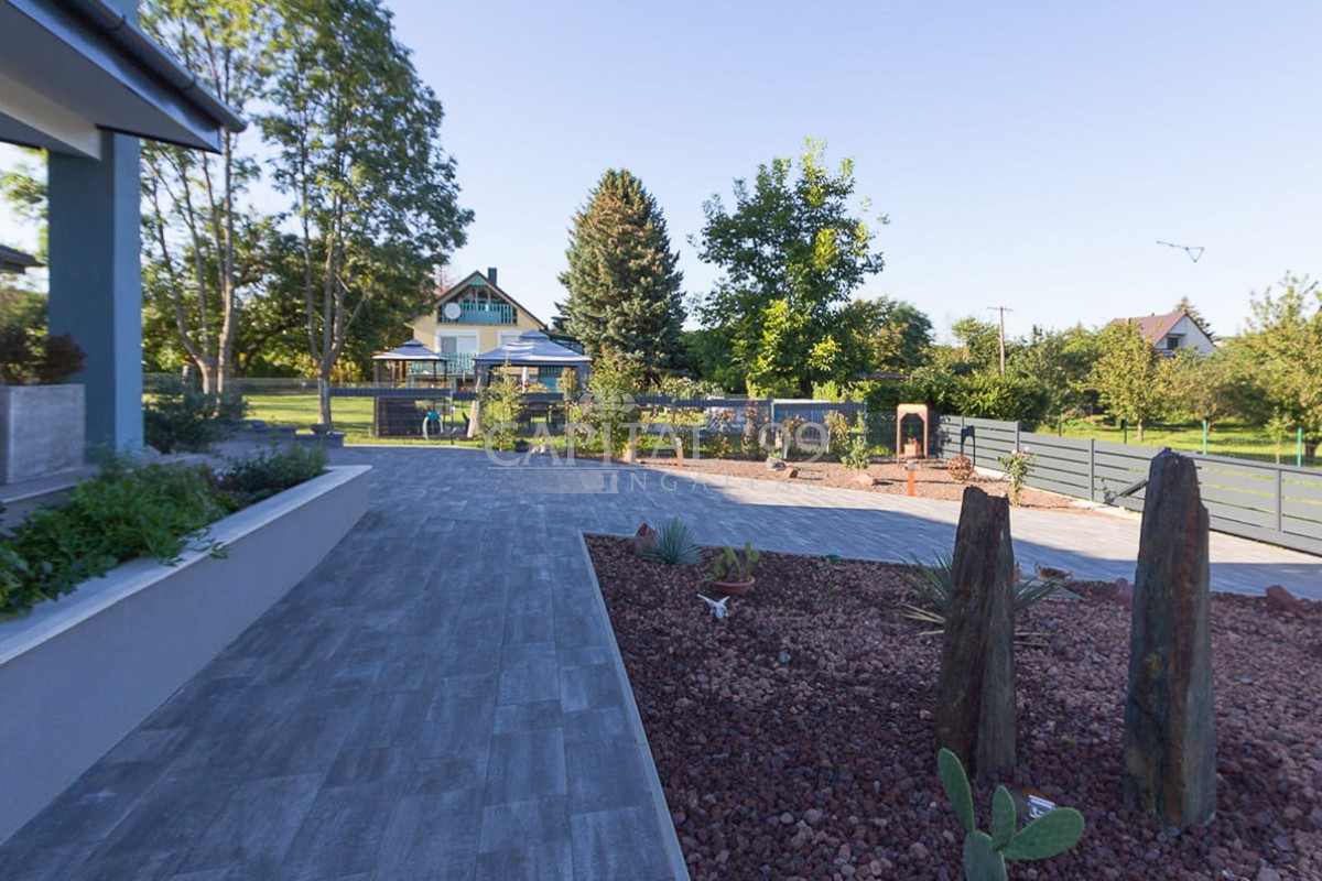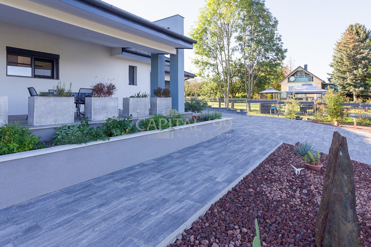 code number: 4357High-standard detached house built in very good quality located in Cserszegtomaj, in a silent street without transit traffic. The house is as new, it is heated via underfloor heating system, which is aided by a solar system. The house is fitted with air conditioners. The tiles, parquet, windows and doors are also of high quality. The lot is lovingly tended, it is endowed with a roofed swimming pool. The garden comes with an irrigation system. There is also a 3 m3 rainwater tank available. The house comes with roofed, practicable terraces, and a 57 sqm garage as well, which is fitted with a workshop-corner. The width of the garage gate amounts to 6 m. This is a high-standard house which comes with an elegant kitchen and spacious rooms. The living room is endowed with a fireplace. This property is well worth a visit, it is a house of excellent quality, you won’t be disappointed! It is the ideal choice for those who seek silence and tranquility. Hévíz and the Lake Balaton is a 10-minute drive.