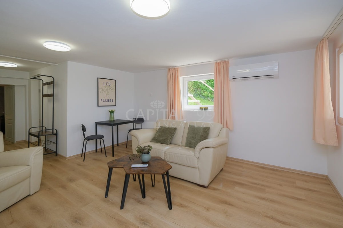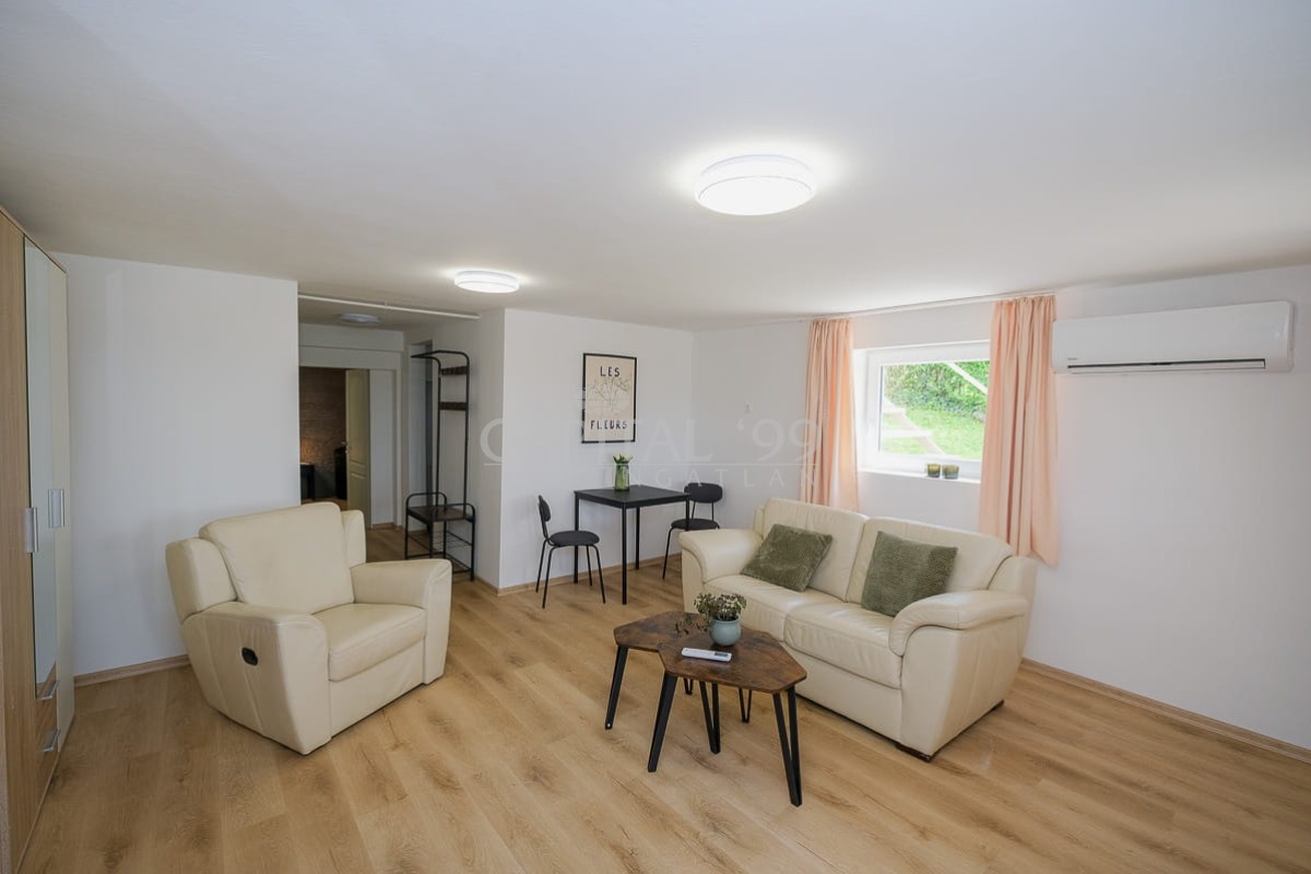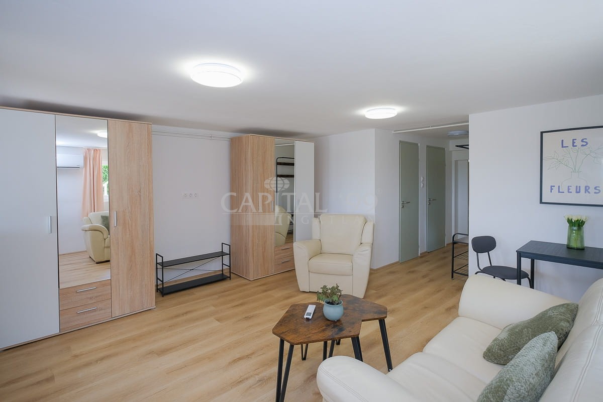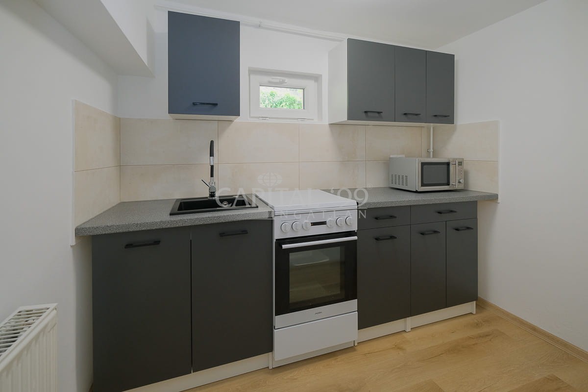 Souterain 49 sqm: sitting room, toilet, bathroom, kitchen, bedroom. Terrace 15 sqm.